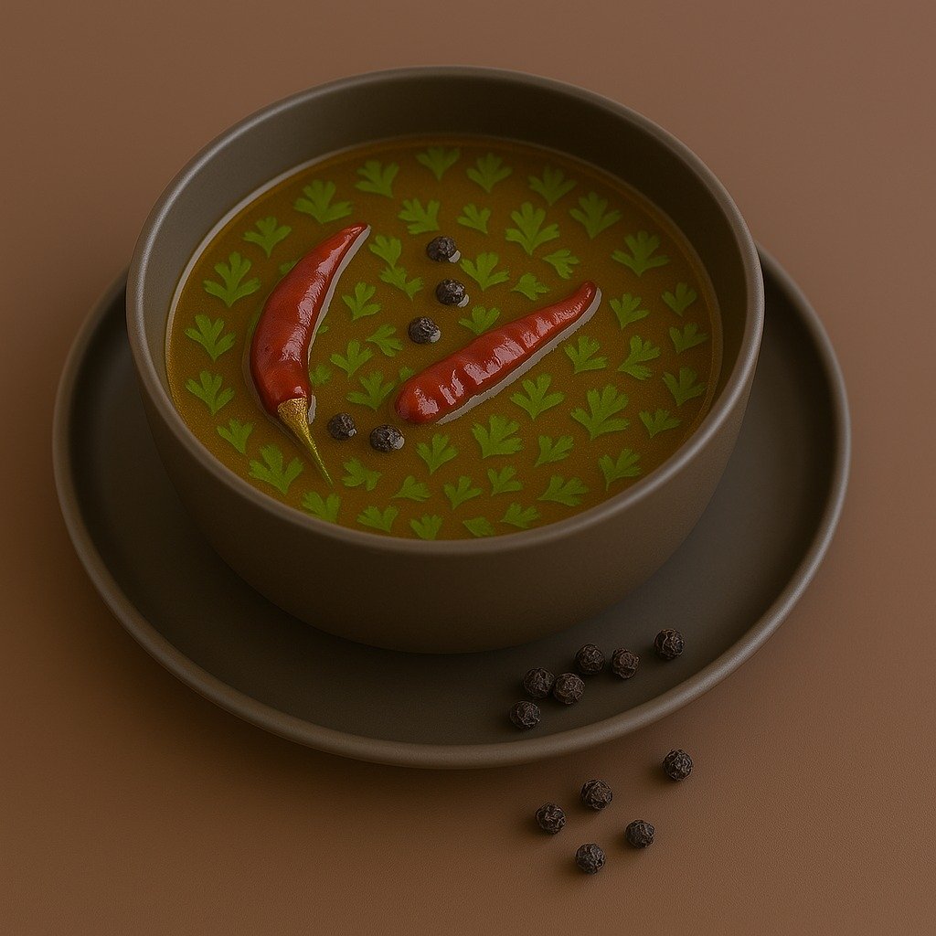 Pepper Rasam (Milaaghu Rasam in Tamil) is a clear, spiced broth made with crushed black pepper, cumin, and sometimes garlic or ginger. It is dal-light or dal-free, tamarind-free or lightly soured, and is used to stimulate agni (digestive fire), clear nasal congestion, and boost circulation.